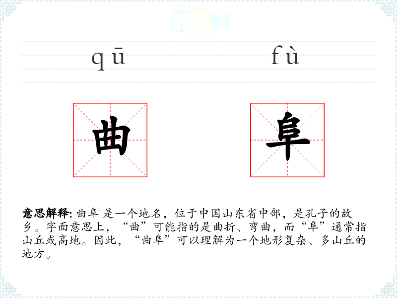 曲阜 是一个地名,位于**山东省中部,是孔子的故乡。字面意思上,“曲”可能指的是曲折、弯曲,而“阜”通常指山丘或高地。因此,“曲阜”可以理解为一个地形复杂、多山丘的地方。