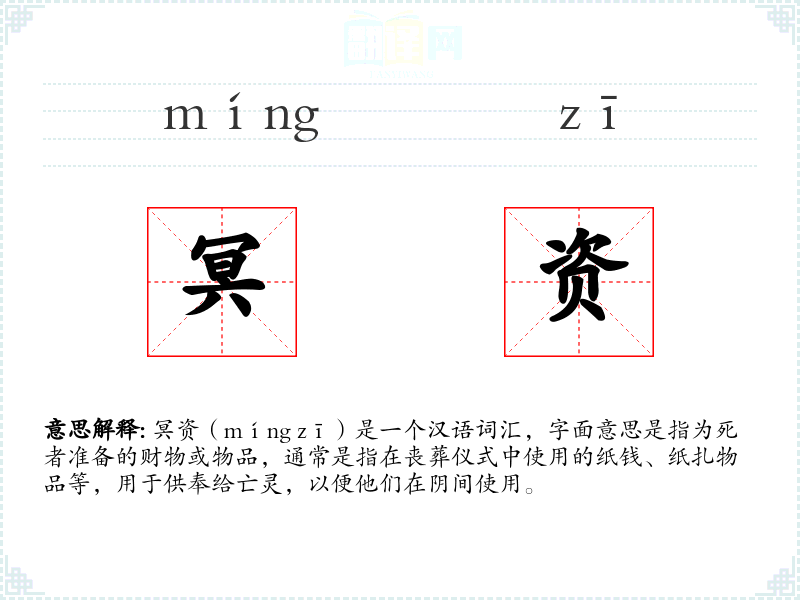 冥资(míng zī)是一个汉语词汇,字面意思是指为死者准备的财物或物品,通常是指在丧葬仪式中使用的纸钱、纸扎物品等,用于供奉给亡灵,以便他们在阴间使用。