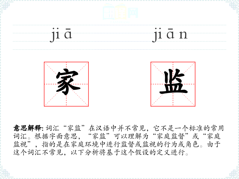词汇“家监”在汉语中并不常见,它不是一个标准的常用词汇。根据字面意思,“家监”可以理解为“家庭监督”或“家庭监视”,指的是在家庭环境中进行监督或监视的行为或角色。由于这个词汇不常见,以下分析将基于这个假设的定义进行。