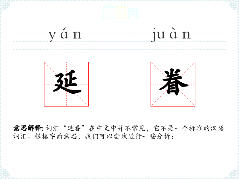 词汇“延眷”在中文中并不常见,它不是一个标准的汉语词汇。根据字面意思,我们可以尝试进行一些分析: