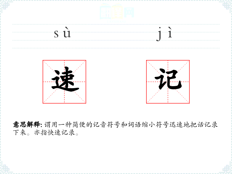 谓用一种简便的记音符号和词语缩小符号迅速地把话记录下来。亦指快速记录。