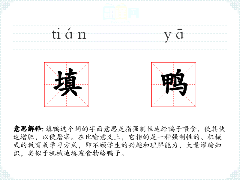填鸭这个词的字面意思是指强制性地给鸭子喂食,使其快速增肥,以便屠宰。在比喻意义上,它指的是一种强制性的、机械式的教育或学*方式,即不顾学生的兴趣和理解能力,大量灌输知识,类似于机械地填塞食物给鸭子。