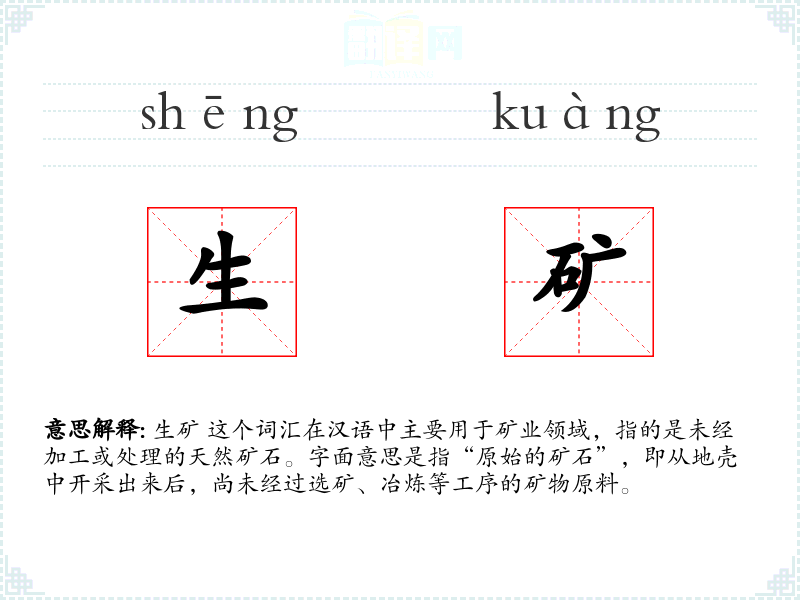 “生矿”这个词汇的词源较为直接,由“生”(原始的、未加工的)和“矿”(矿石)组成。在矿业发展的历史中,随着对矿石加工技术的不断进步,这个词汇的使用逐渐专业化。
