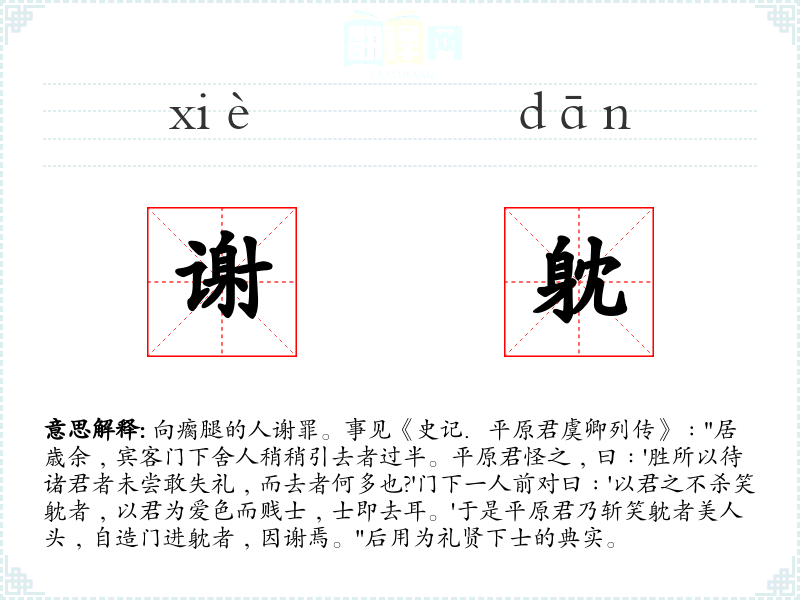 1.向瘸腿的人谢罪。事见《史记.平原君虞卿列传》﹕"居歳余﹐宾客门下舍人稍稍引去者过半。平原君怪之﹐曰﹕'胜所以待诸君者未尝敢失礼﹐而去者何多也?'门下一人前对曰﹕'以君之不杀笑躭者﹐以君为爱色而贱士﹐士即去耳。'于是平原君乃斩笑躭者美人头﹐自造门进躭者﹐因谢焉。"后用为礼贤下士的典实。