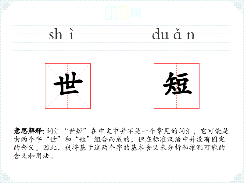 词汇“世短”在中文中并不是一个常见的词汇,它可能是由两个字“世”和“短”组合而成的,但在标准汉语中并没有固定的含义。因此,我将基于这两个字的基本含义来分析和推测可能的含义和用法。