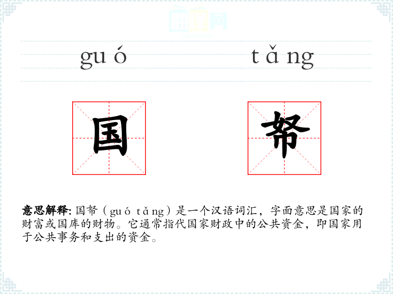 国帑(guó tǎng)是一个汉语词汇,字面意思是国家的财富或国库的财物。它通常指代国家财政中的公共资金,即国家用于公共事务和支出的资金。