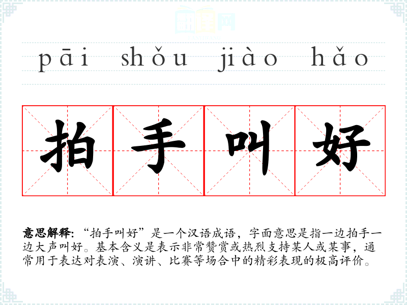 “拍手叫好”是一个汉语成语,字面意思是指一边拍手一边大声叫好。基本含义是表示非常赞赏或热烈支持某人或某事,通常用于表达对表演、演讲、比赛等场合中的精彩表现的极高评价。