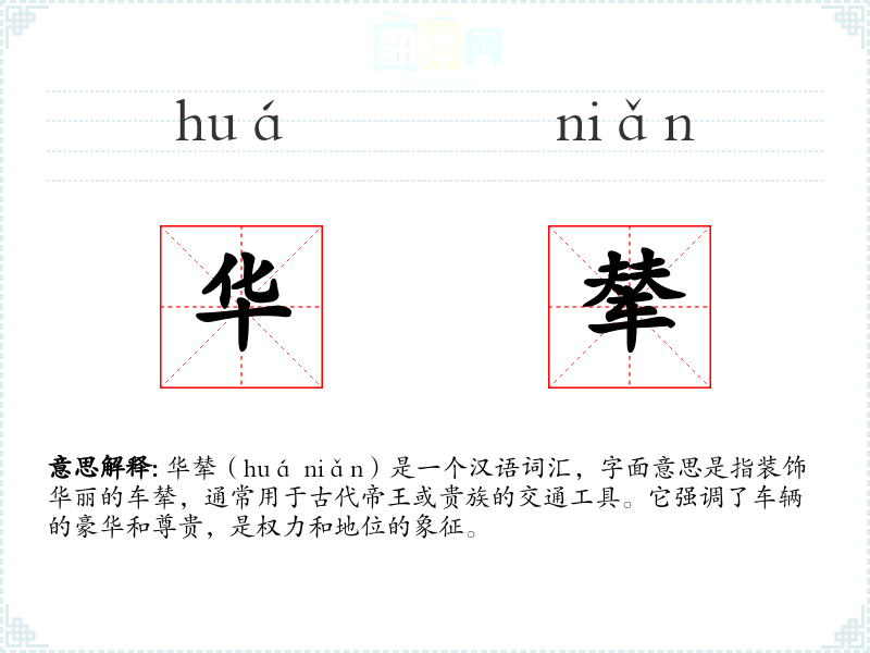 华辇(huá niǎn)是一个汉语词汇,字面意思是指装饰华丽的车辇,通常用于古代帝王或贵族的交通工具。它强调了车辆的豪华和尊贵,是权力和地位的象征。