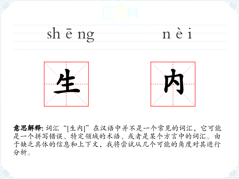 由于“[生内]”不是一个标准汉语词汇,我们无法对其进行深入的分析和理解。在语言学习和表达中,了解词汇的准确含义和用法是非常重要的,因此在遇到不熟悉的词汇时,建议查找权威的词典或资料以获取准确信息。