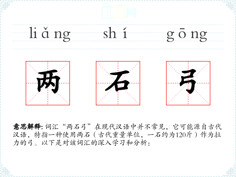 词汇“两石弓”在现代汉语中并不常见,它可能源自古代汉语,特指一种使用两石(古代重量单位,一石约为120斤)作为拉力的弓。以下是对该词汇的深入学*和分析: