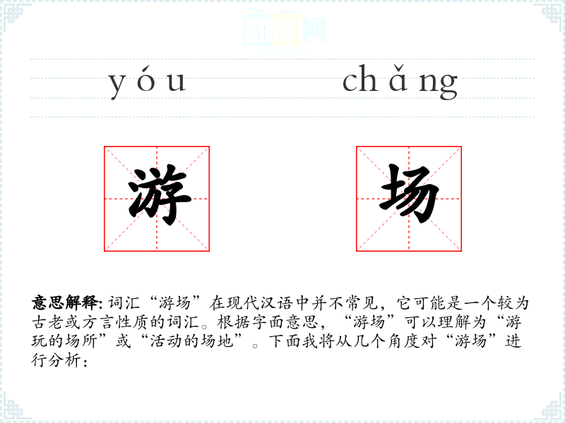 词汇“游场”在现代汉语中并不常见,它可能是一个较为古老或方言性质的词汇。根据字面意思,“游场”可以理解为“游玩的场所”或“活动的场地”。下面我将从几个角度对“游场”进行分析: