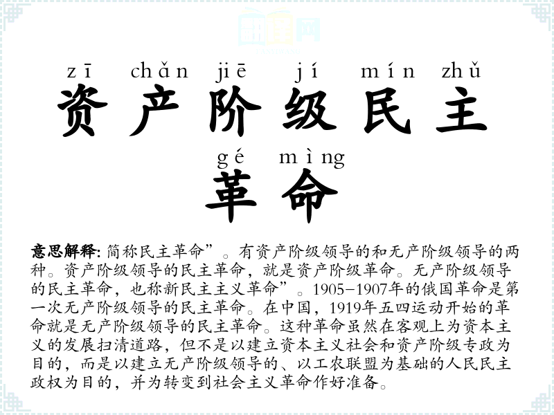 简称民主革命”。有资产阶级领导的和无产阶级领导的两种。资产阶级领导的民主革命,就是资产阶级革命。无产阶级领导的民主革命,也称新民主主义革命”。1905-1907年的俄国革命是第一次无产阶级领导的民主革命。在中国,1919年五四运动开始的革命就是无产阶级领导的民主革命。这种革命虽然在客观上为资本主义的发展扫清道路,但不是以建立资本主义社会和资产阶级专政为目的,而是以建立无产阶级领导的、以工农联盟为基础的人民民主政权为目的,并为转变到社会主义革命作好准备。