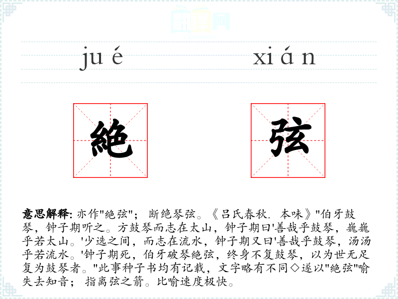 1.亦作"絶弦"; 断绝琴弦。《吕氏春秋.本味》"伯牙鼓琴,钟子期听之。方鼓琴而志在太山,钟子期曰'善哉乎鼓琴,巍巍乎若太山。'少选之间,而志在流水,钟子期又曰'善哉乎鼓琴,汤汤乎若流水。'钟子期死,伯牙破琴絶弦,终身不复鼓琴,以为世无足复为鼓琴者。"此事种子书均有记载,文字略有不同◇遂以"絶弦"喻失去知音; 指离弦之箭。比喻速度极快。