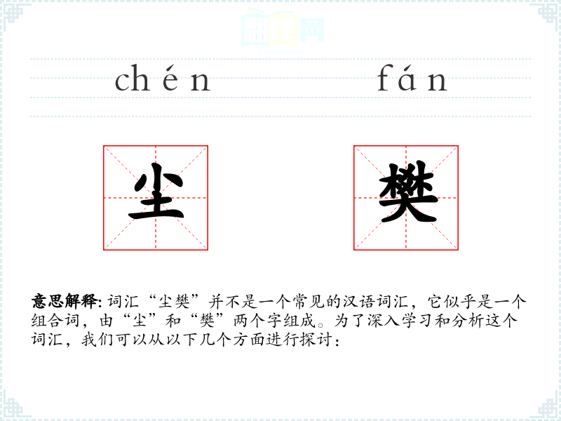 词汇“尘樊”并不是一个常见的汉语词汇,它似乎是一个组合词,由“尘”和“樊”两个字组成。为了深入学习和分析这个词汇,我们可以从以下几个方面进行探讨: