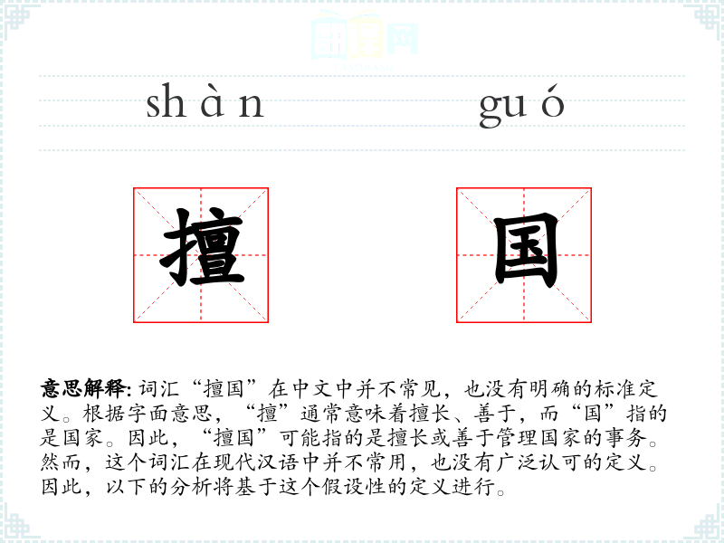 词汇“擅国”在中文中并不常见,也没有明确的标准定义。根据字面意思,“擅”通常意味着擅长、善于,而“国”指的是国家。因此,“擅国”可能指的是擅长或善于管理国家的事务。然而,这个词汇在现代汉语中并不常用,也没有广泛认可的定义。因此,以下的分析将基于这个假设性的定义进行。