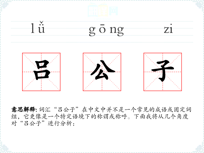 词汇“吕公子”在中文中并不是一个常见的成语或固定词组,它更像是一个特定语境下的称谓或称呼。下面我将从几个角度对“吕公子”进行分析:
