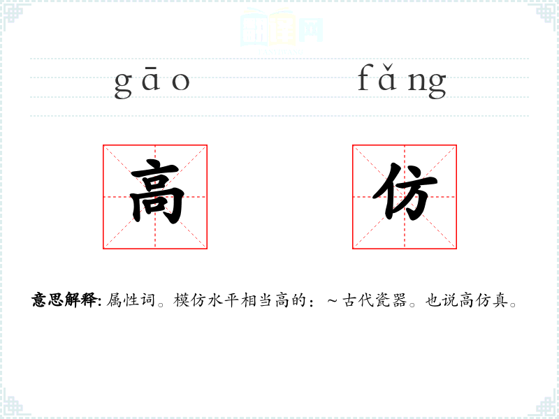 属性词。模仿水平相当高的:~古代瓷器。也说高仿真。