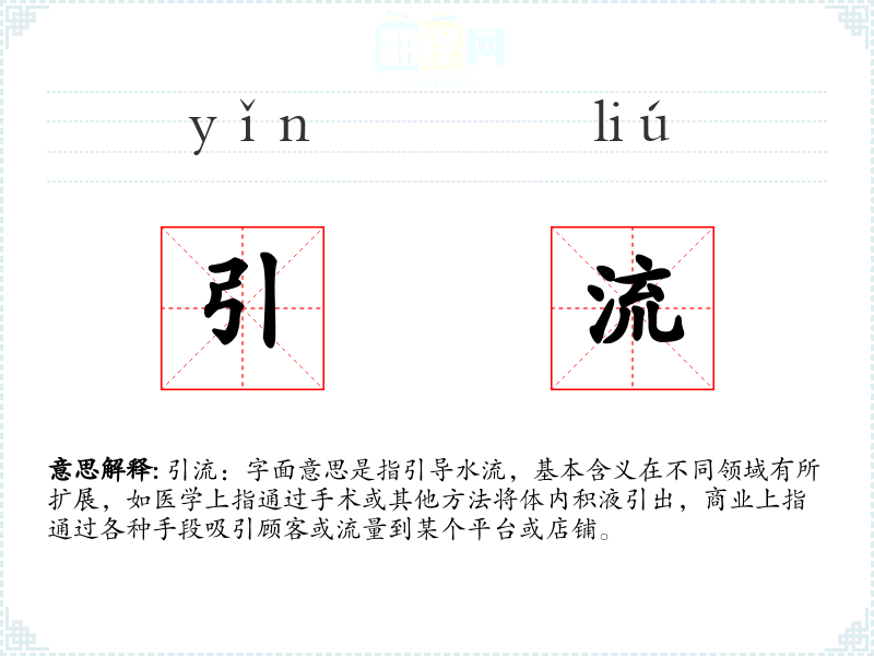 引流:字面意思是指引导水流,基本含义在不同领域有所扩展,如医学上指通过手术或其他方法将体内积液引出,商业上指通过各种手段吸引顾客或流量到某个平台或店铺。