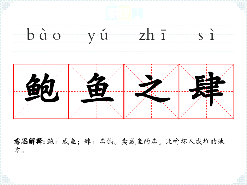 鲍:咸鱼;肆:店铺。卖咸鱼的店。比喻坏人成堆的地方。