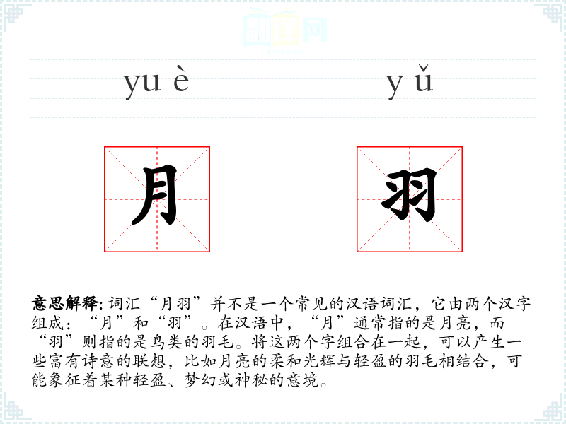 在文学作品中,“月羽”可能被用来形容某种轻盈、飘渺或梦幻的景象,如“她的舞姿如月羽般轻盈”。在口语中,这个词汇可能不太常用,除非是在特定的文学或艺术讨论中。