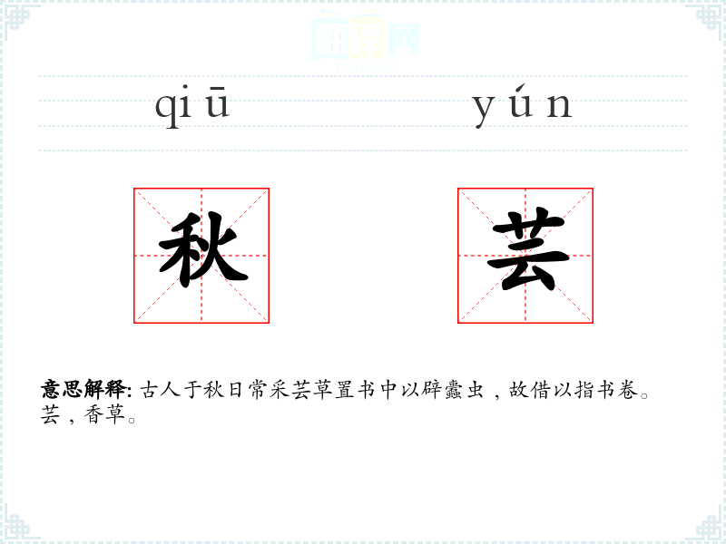 古人于秋日常采芸草置书中以辟蠹虫﹐故借以指书卷。芸﹐香草。