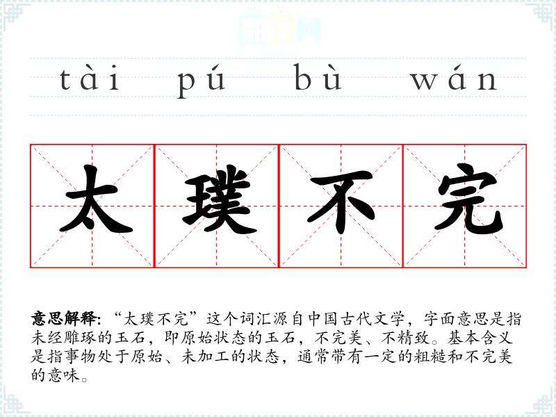 “太璞不完”这个词汇源自**古代文学,字面意思是指未经雕琢的玉石,即原始状态的玉石,不完美、不精致。基本含义是指事物处于原始、未加工的状态,通常带有一定的粗糙和不完美的意味。