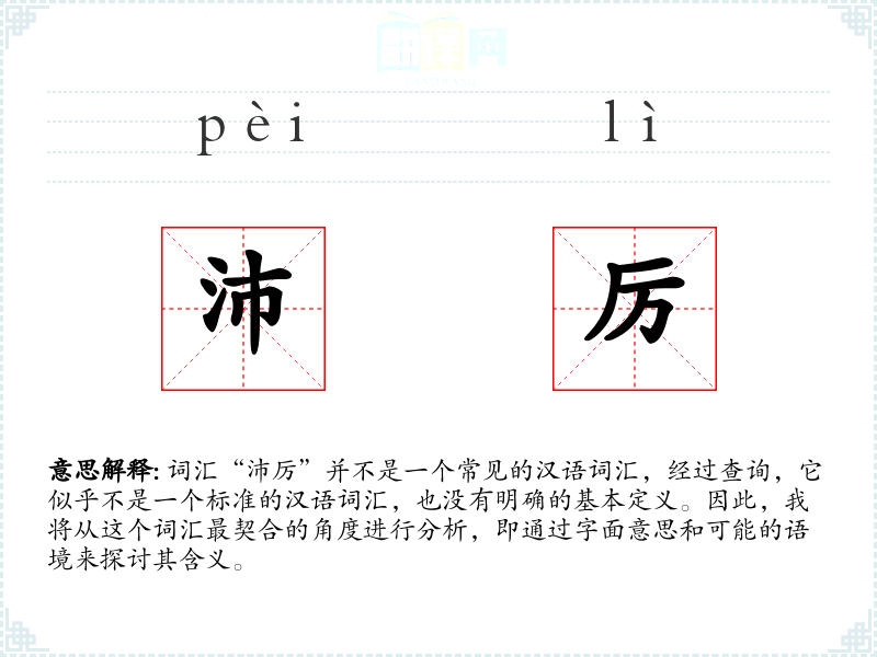 词汇“沛厉”并不是一个常见的汉语词汇,经过查询,它似乎不是一个标准的汉语词汇,也没有明确的基本定义。因此,我将从这个词汇最契合的角度进行分析,即通过字面意思和可能的语境来探讨其含义。