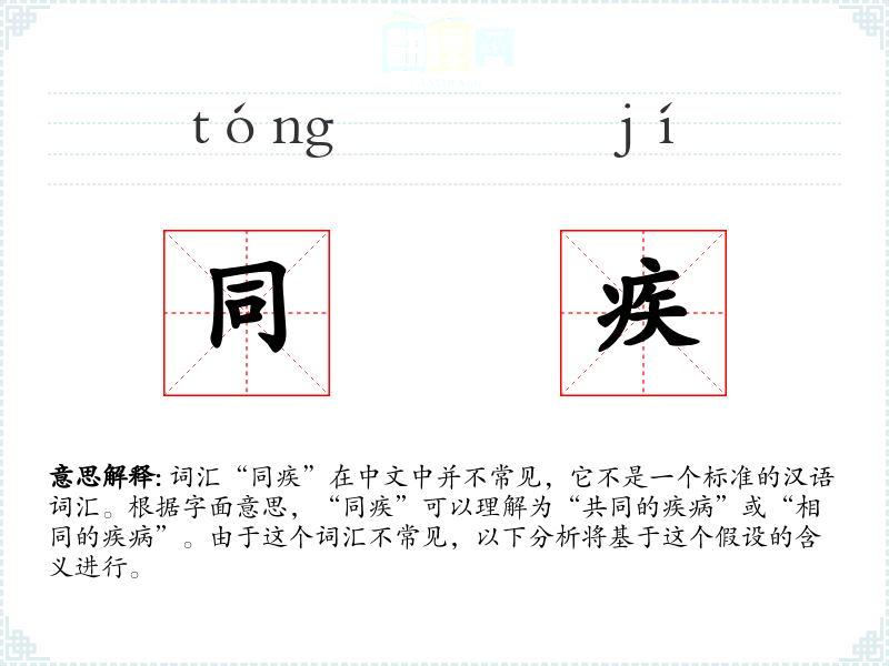 词汇“同疾”在中文中并不常见,它不是一个标准的汉语词汇。根据字面意思,“同疾”可以理解为“共同的疾病”或“相同的疾病”。由于这个词汇不常见,以下分析将基于这个假设的含义进行。