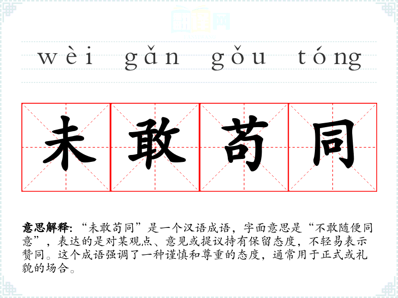 “未敢苟同”是一个汉语成语,字面意思是“不敢随便同意”,表达的是对某观点、意见或提议持有保留态度,不轻易表示赞同。这个成语强调了一种谨慎和尊重的态度,通常用于正式或礼貌的场合。