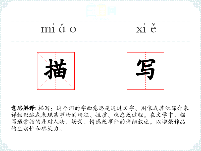 描写:这个词的字面意思是通过文字、图像或其他媒介来详细叙述或表现某事物的特征、性质、状态或过程。在文学中,描写通常指的是对人物、场景、情感或**的详细叙述,以增强作品的生动性和感染力。