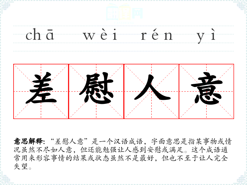 “差慰人意”是一个汉语成语,字面意思是指某事物或情况虽然不尽如人意,但还能勉强让人感到安慰或满足。这个成语通常用来形容事情的结果或状态虽然不是最好,但也不至于让人完全失望。