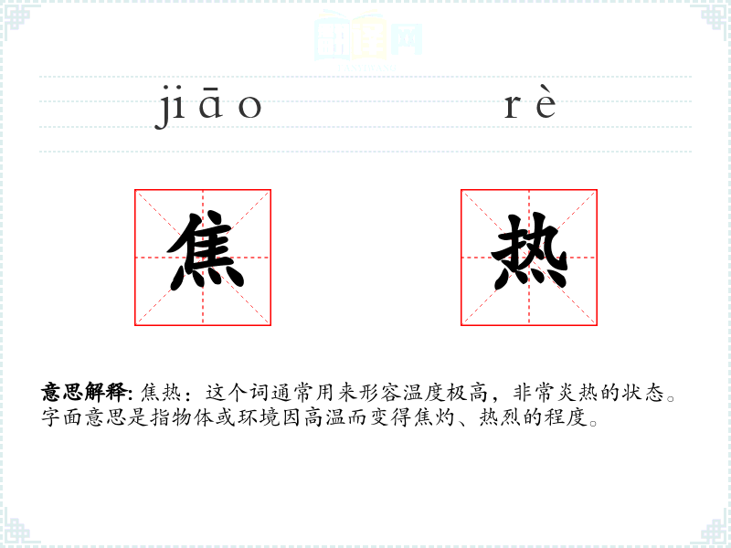 焦热:这个词通常用来形容温度极高,非常炎热的状态。字面意思是指物体或环境因高温而变得焦灼、热烈的程度。