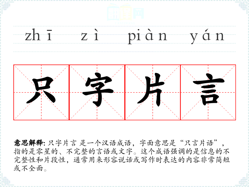 只字片言 是一个汉语成语,字面意思是“只言片语”,指的是零星的、不完整的言语或文字。这个成语强调的是信息的不完整性和片段性,通常用来形容说话或写作时表达的内容非常简短或不全面。