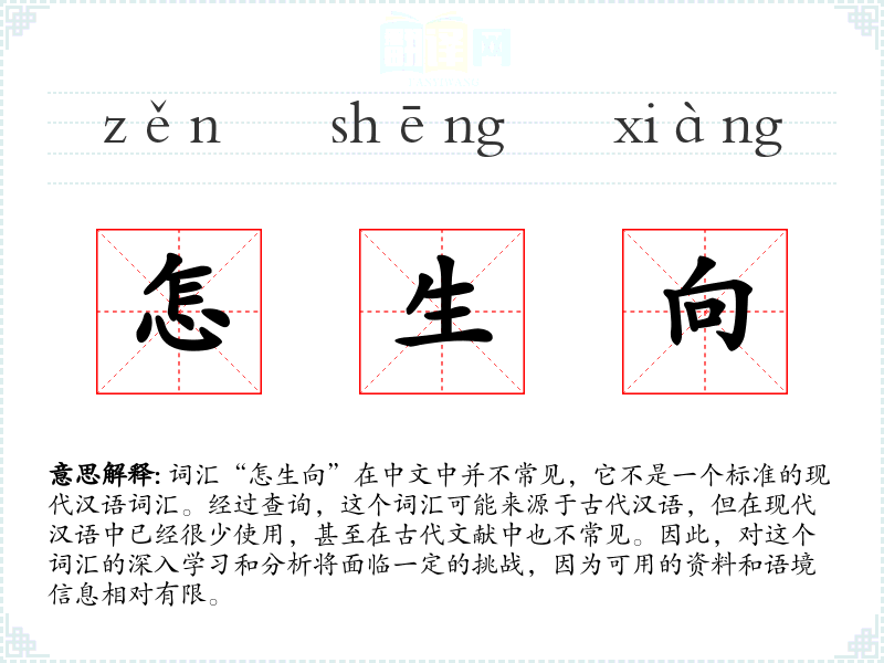 由于“怎生向”在现代汉语中不常见,我们无法给出一个确切的基本定义。它可能是由“怎生”和“向”两个词组合而成的,其中“怎生”在古代汉语中意为“如何”或“怎样”,而“向”则有“朝向”或“方向”的意思。结合起来,可能是在询问某个方向或方式是如何的。