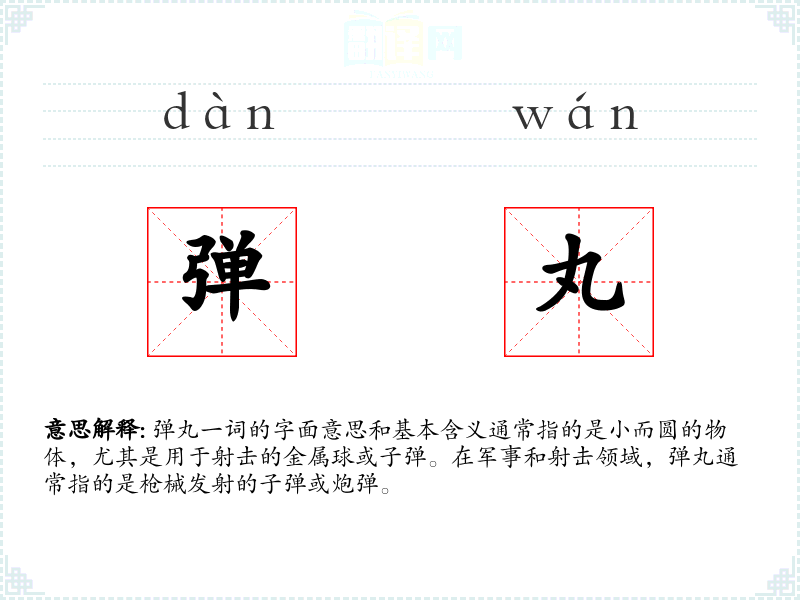 弹丸一词的字面意思和基本含义通常指的是小而圆的物体,尤其是用于射击的金属球或子弹。在军事和射击领域,弹丸通常指的是枪械发射的子弹或炮弹。