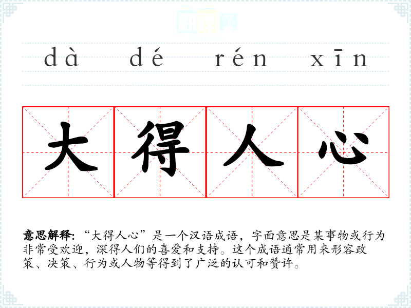 “大得人心”是一个汉语成语,字面意思是某事物或行为非常受欢迎,深得人们的喜爱和支持。这个成语通常用来形容政策、决策、行为或人物等得到了广泛的认可和赞许。