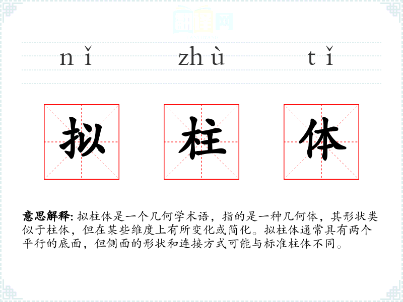 在数学和几何学专业领域中,拟柱体是一个精确的术语,用于描述特定的几何形状。在文学或口语中,这个词汇可能不太常见,除非是在讨论抽象或比喻性的概念时,可能会用到“拟柱体”来比喻某种结构或形态。
