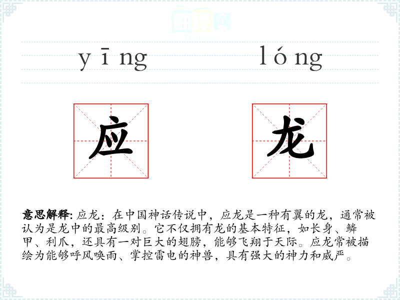 同义词:神龙、龙王、天龙(这些词汇都指代强大的龙,但应龙特指有翼的龙) 反义词:地龙、水蛇(这些词汇指代较弱或低级的龙或蛇类)