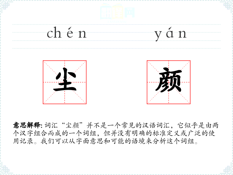 词汇“尘颜”并不是一个常见的汉语词汇,它似乎是由两个汉字组合而成的一个词组,但并没有明确的标准定义或广泛的使用记录。我们可以从字面意思和可能的语境来分析这个词组。