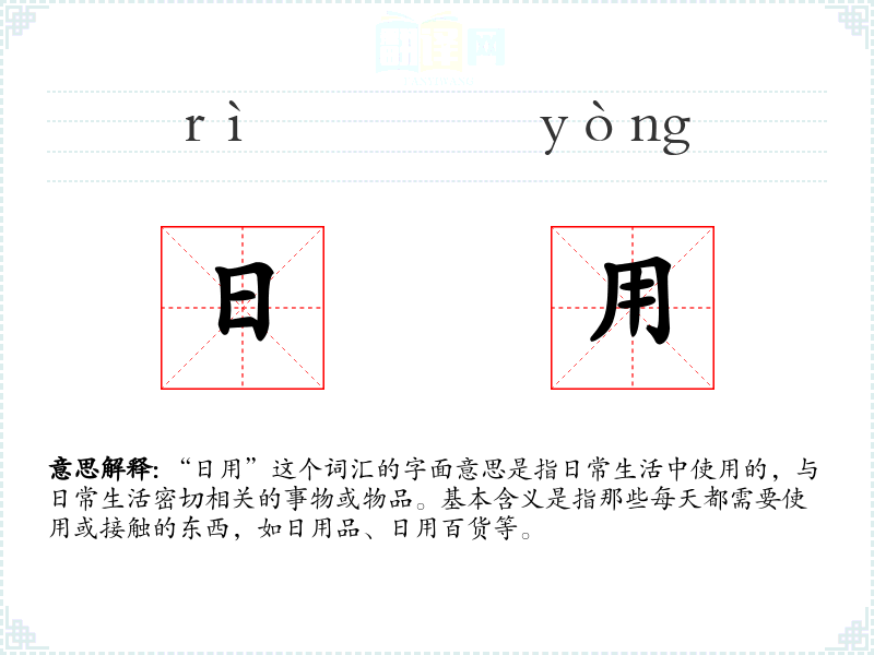 在不同语言或文化中,“日用”可能有对应的词汇,如英语中的“daily necessities”或“household items”。这些词汇在不同文化中的使用情况可能有所不同,但基本含义相似,都指日常生活中必需的物品。