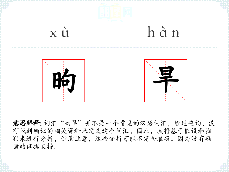 词汇“昫旱”并不是一个常见的汉语词汇,经过查询,没有找到确切的相关资料来定义这个词汇。因此,我将基于假设和推测来进行分析,但请注意,这些分析可能不完全准确,因为没有确凿的证据支持。