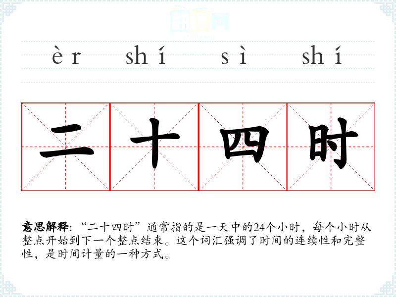 “二十四时”通常指的是一天中的24个小时,每个小时从整点开始到下一个整点结束。这个词汇强调了时间的连续性和完整性,是时间计量的一种方式。