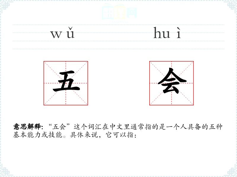 “五会”这个词汇在中文里通常指的是一个人具备的五种基本能力或技能。具体来说,它可以指: