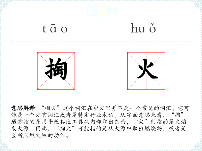 由于“掏火”不是一个标准汉语词汇,它的词源和演变可能与特定地区的方言或行业术语有关。在某些地区,人们可能因为习惯用语而形成了这样的词汇。