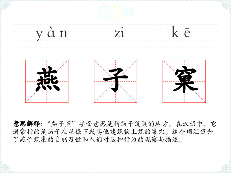 “燕子窠”字面意思是指燕子筑巢的地方。在汉语中,它通常指的是燕子在屋檐下或其他建筑物上筑的巢穴。这个词汇蕴含了燕子筑巢的自然*性和人们对这种行为的观察与描述。