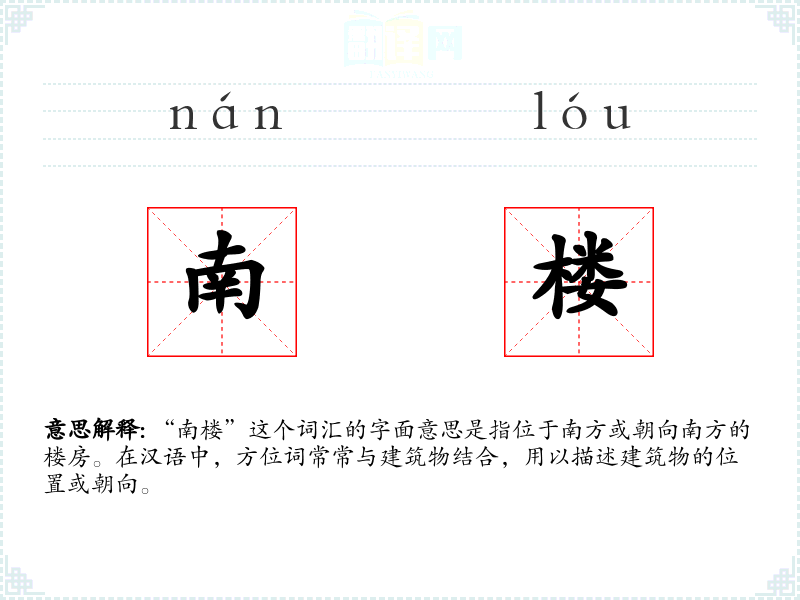 “南楼”这个词汇的字面意思是指位于南方或朝向南方的楼房。在汉语中,方位词常常与建筑物结合,用以描述建筑物的位置或朝向。