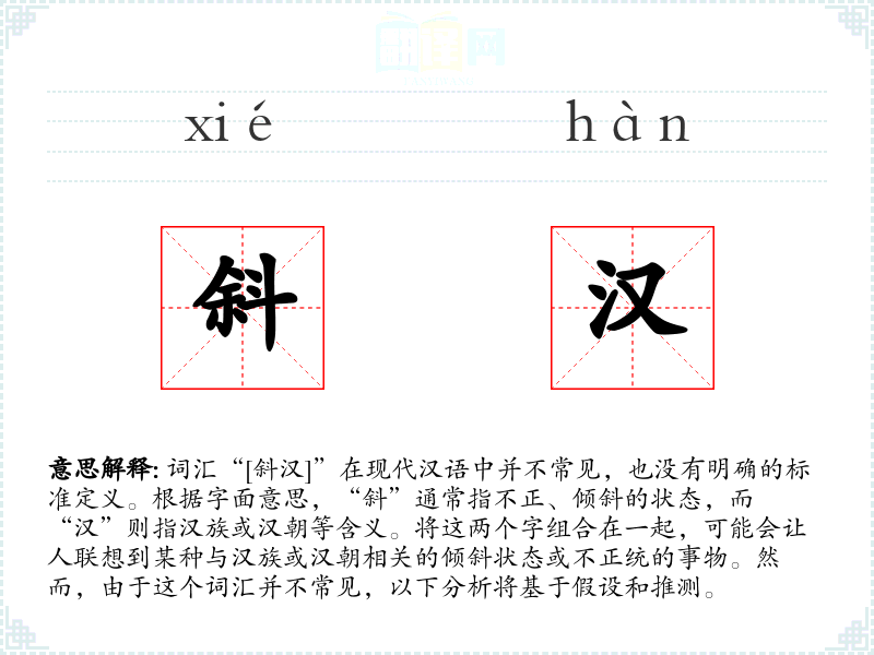 词汇“[斜汉]”在现代汉语中并不常见,也没有明确的标准定义。根据字面意思,“斜”通常指不正、倾斜的状态,而“汉”则指或汉朝等含义。将这两个字组合在一起,可能会让人联想到某种与或汉朝相关的倾斜状态或不正统的事物。然而,由于这个词汇并不常见,以下分析将基于假设和推测。