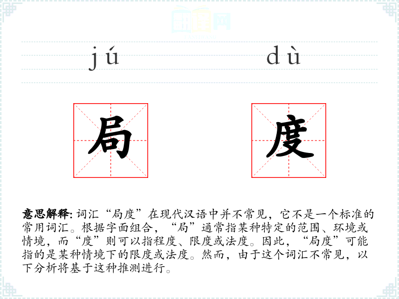 词汇“局度”在现代汉语中并不常见,它不是一个标准的常用词汇。根据字面组合,“局”通常指某种特定的范围、环境或情境,而“度”则可以指程度、限度或法度。因此,“局度”可能指的是某种情境下的限度或法度。然而,由于这个词汇不常见,以下分析将基于这种推测进行。
