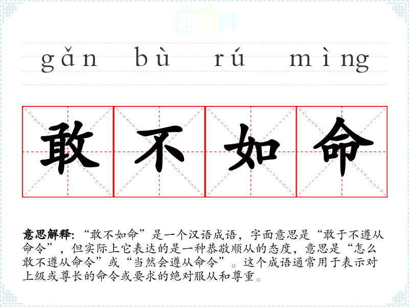 在文学作品中,“敢不如命”常用于描绘人物对权威的尊重和服从,尤其是在古代宫廷或官场背景中。在口语中,这个成语可能不太常用,但在正式或庄重的场合,如官方文件或正式演讲中,仍可听到其使用。在专业领域,如法律或军事,这个成语可能用于强调对规则或命令的严格遵守。