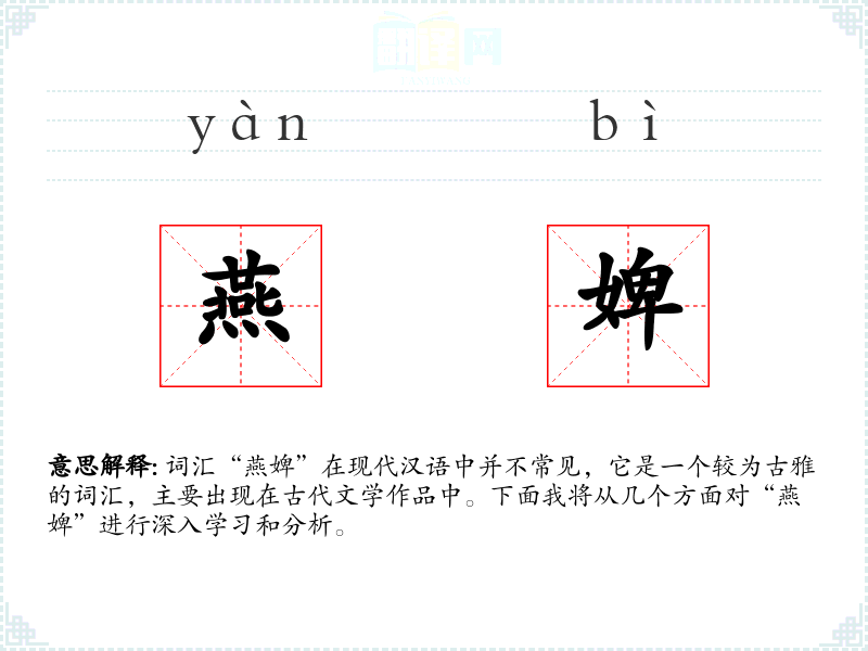 词汇“燕婢”在现代汉语中并不常见,它是一个较为古雅的词汇,主要出现在古代文学作品中。下面我将从几个方面对“燕婢”进行深入学*和分析。